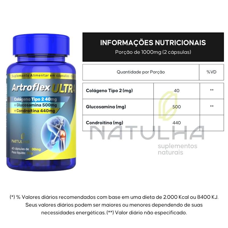 Este suplemento alimentar é formulado com ingredientes como Glucosamina, Condroitina e Colágeno Tipo 2, substâncias importantes para a saúde das articulações. Ele é indicado para quem busca fortalecer e manter a mobilidade articular, melhorar a flexibilidade e reduzir os efeitos do desgaste natural das articulações.