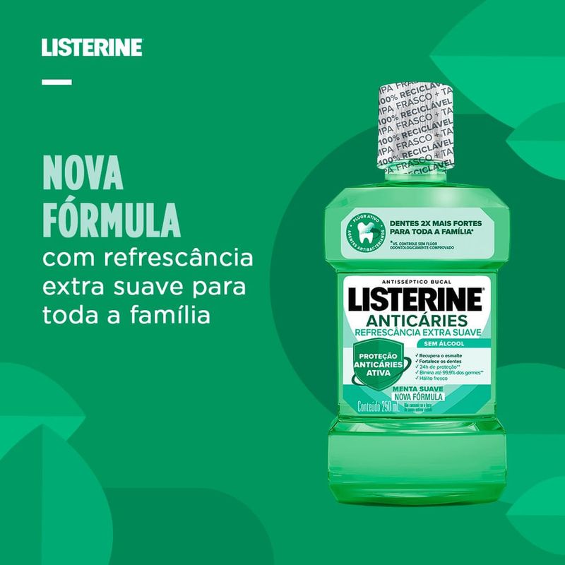 LISTERINE possui fórmula clinicamente comprovada com 4 poderosos agentes antibacterianos, sendo eles Salicilato de metila, eucaliptol, timol e mentol. Além de Flúor que previne cáries e fortalece esmalte.