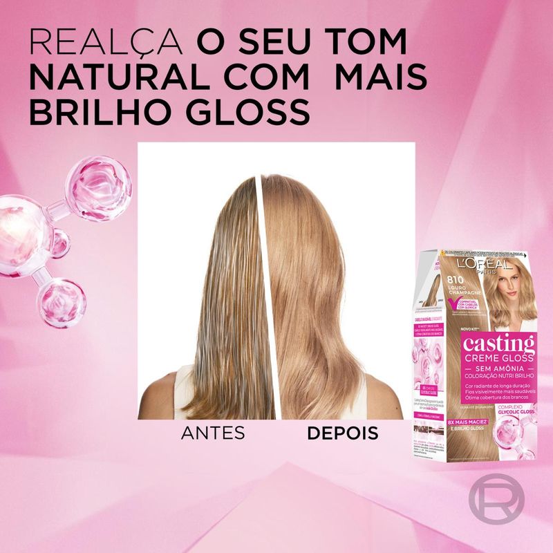 O Casting Creme Gloss 810 Louro Champagne serve para realçar os cabelos com um tom loiro claro elegante, cobrindo fios brancos e garantindo brilho gloss radiante. É indicado para quem deseja um visual iluminado e sofisticado, com coloração suave, sem amônia e que ainda trata a fibra capilar, proporcionando toque sedoso, hidratação e reflexos duradouros.