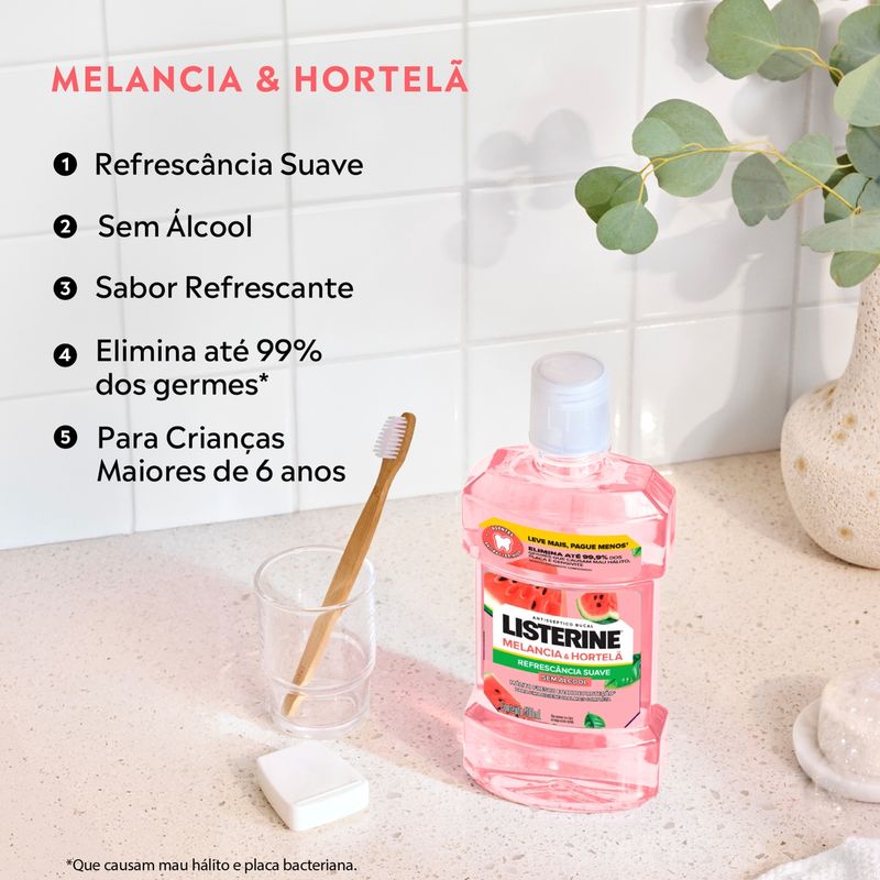 O Antisséptico Bucal Listerine Melancia & Hortelã Refrescância Suave Sem Álcool é um enxaguante desenvolvido para uma rotina completa de Higiene oral, oferecendo limpeza profunda com sensação suave e sabor agradável. Com a qualidade da marca Listerine, sua fórmula combina agentes antibacterianos que matam 99,9% dos germes causadores de mau hálito, placa e gengivite, sem o uso de álcool, o que garante conforto para quem tem mucosas sensíveis. Indicado para complementar a escovação e o fio dental, pertence à categoria de Saúde Bucal, mais especificamente à subcategoria enxaguante bucal.
