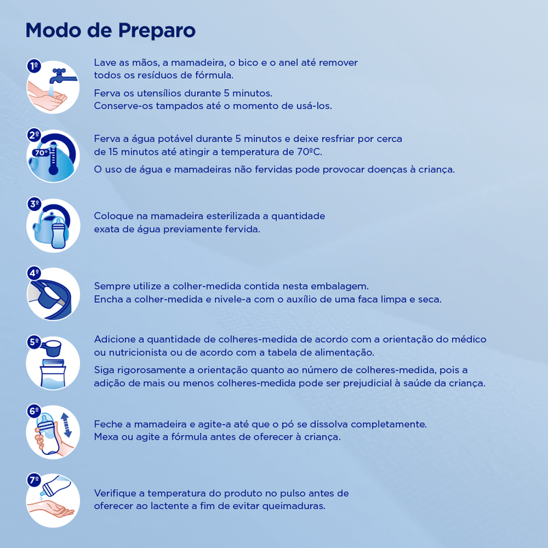 Para preparar a fórmula, lave bem as mãos, a mamadeira, o bico e o anel até remover todos os resíduos. Ferva os utensílios por 5 minutos e conserve-os tampados até o momento do uso. Ferva água potável por 5 minutos e deixe resfriar por cerca de 15 minutos até atingir a temperatura de 70°C. Coloque na mamadeira esterilizada a quantidade exata de água previamente fervida. Utilize a colher-medida contida na embalagem para adicionar o número de medidas rasas de pó, seguindo a orientação do médico ou nutricionista ou a tabela de alimentação do produto. Feche a mamadeira e agite bem até que o pó se dissolva completamente. Verifique a temperatura do produto no pulso antes de oferecer ao lactente para evitar queimaduras. Siga rigorosamente as instruções de preparo.