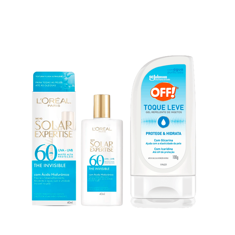 Protetor Solar Facial L’Oréal Paris Solar Expertise The Invisible FPS60 40ml: protege o rosto contra os raios UVA e UVB, com textura leve e acabamento invisível. Repelente OFF! Toque Leve Icaridina Sem Perfume Gel 100g: oferece proteção eficaz contra insetos, com fórmula sem fragrância e rápida absorção.