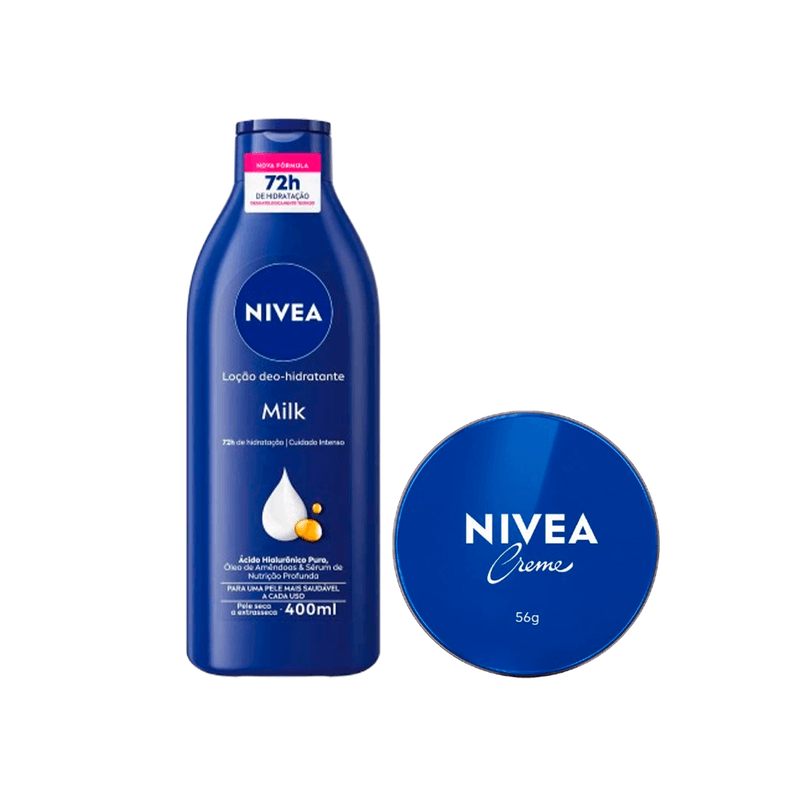 Creme Hidratante Nivea Lata 56g: creme clássico da marca com textura espessa, que hidrata profundamente e ajuda a recuperar o ressecamento, ideal para áreas como mãos, cotovelos e pés. Loção Corporal Nivea Milk Hidratação Profunda 72h 400ml: loção corporal enriquecida com óleo de amêndoas e Deep Moisture Serum, que hidrata por até 72 horas e fortalece a barreira natural da pele.