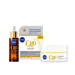 Sérum Facial Nivea Q10 Antissinais Expert Dupla Ação 30ml: sérum concentrado com Q10 puro e ação antioxidante, que combate rugas profundas, melhora a firmeza e deixa a pele mais uniforme. Creme Facial Nivea Q10 Power Antissinais FPS 30 50g: hidratante facial antissinais com Q10 e proteção FPS 30, que reduz linhas de expressão, melhora a elasticidade e protege contra danos solares.
