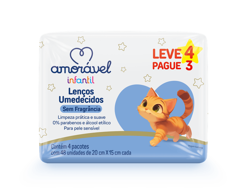 Lenços Umedecidos Amorável foram desenvolvidos especialmente para proteger e cuidar da pele do seu bebê. Eles são especialmente macios, espessos e mais absorventes, proporcionando uma limpeza prática e eficiente na troca de fraldas, hidratando, protegendo e evitando o ressecamento da pele do seu bebê. Sua embalagem é prática e econômica, facilitando o manuseio, no carro, em viagens e outras ocasiões.