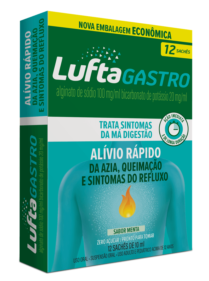 LuftaGastroPro é um medicamento indicado para os sintomas do refluxo, como regurgitação ácida, queimação (azia) e dispepsia (má digestão), inclusive após cirurgias gástricas, hérnia de hiato (penetração de parte do estômago na cavidade torácica) e esofagite (inflamação no esôfago). Indicado também para os sintomas do refluxo supraesofágico. Pode ser utilizado durante o tratamento com inibidores da bomba de próton (por exemplo omeprazol) ou antagonistas dos receptores H2 (por exemplo cloridrato de ranitidina). Após a ingestão de LuftaGastroPro, a suspensão reage rapidamente com o ácido do estômago e forma uma camada de gel de ácido algínico com pH aproximadamente neutro, que flutua sobre o conteúdo estomacal impedindo o refluxo por até 4 horas. Em casos severos, a barreira de gel de ácido algínico pode refluir pelo esôfago em substituição ao conteúdo gástrico, promovendo alívio da azia e queimação. Além disso, a barreira formada é capaz de proteger a mucosa esofágica da ação das substâncias contidas no estômago. A formação da camada de gel de ácido algínico é muito rápida, em torno de 15 segundos. Por este motivo, o início do alívio dos sintomas costuma ser muito rápido após a administração do medicamento.