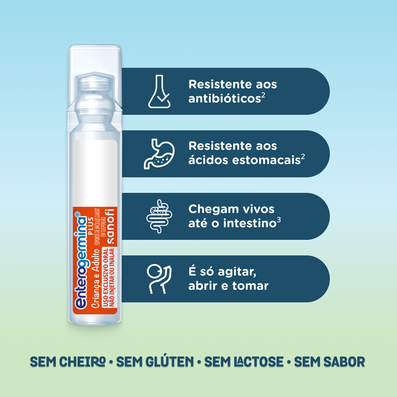 O Enterogermina Plus é um probiótico em suspensão oral que contribui para a saúde gastrointestinal. Cada dose contém 4 bilhões de esporos de Bacillus clausii, um microrganismo benéfico que auxilia no equilíbrio da flora intestinal, que pode ser desregulada por diversos fatores como o uso de antibióticos, estresse ou alimentação inadequada. Este produto não é um medicamento, mas sim um alimento funcional que ajuda a restaurar o bem-estar do seu intestino, fortalecendo as defesas naturais do organismo. Sua apresentação em frascos individuais torna o consumo prático e fácil para o dia a dia.
