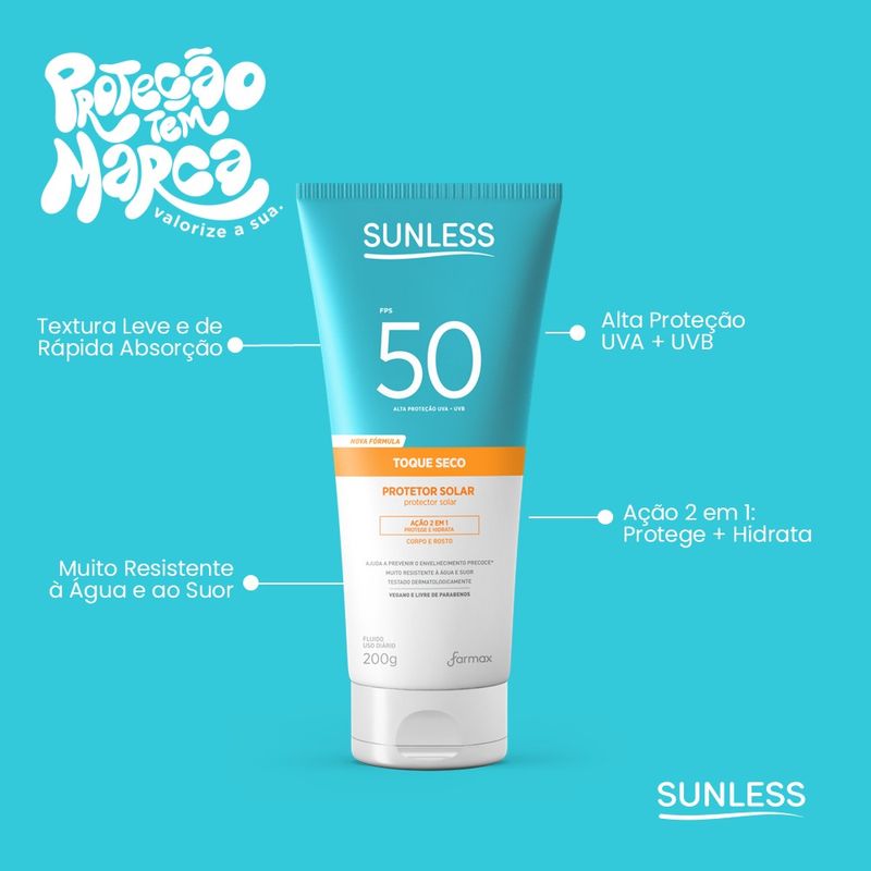 O Protetor Solar Corporal Sunless Toque Seco FPS50 200g é um protetor solar de alta proteção desenvolvido para todos os tipos de pele, incluindo as mais sensíveis às queimaduras solares. Com uma textura leve e de toque seco, ele oferece proteção contra os raios UVA e UVB, além de ser resistente à água e ao suor. O Sunless Toque Seco também ajuda a combater os radicais livres e o envelhecimento precoce, sendo ideal para uso diário. Dermatologicamente testado, sua fórmula é livre de parabenos e clinicamente comprovada, garantindo segurança e eficácia para uma proteção completa.