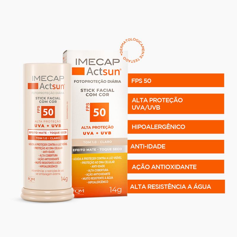O Protetor Solar Facial Imecap Actsun FPS 50 14g é um dermocosmético desenvolvido para proteger a pele do rosto contra os efeitos nocivos dos raios UVA e UVB. Com alta proteção solar, ele auxilia na prevenção do envelhecimento precoce, manchas solares e queimaduras, além de contribuir para a manutenção de uma pele saudável. Sua fórmula leve e de rápida absorção é ideal para o uso diário, inclusive sob a maquiagem. É indicado para todos os tipos de pele, inclusive as mais sensíveis.