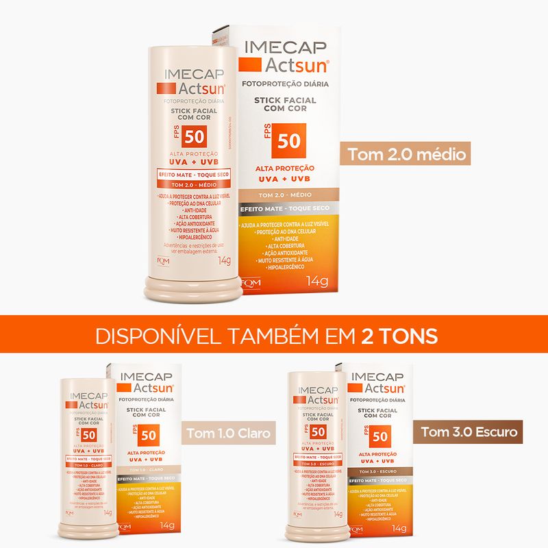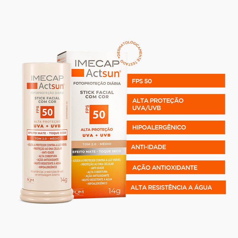 O Protetor Solar Facial Imecap Actsun Médio FPS 50 14g é um dermocosmético multifuncional que une proteção solar e uniformização da pele. Com cor de tonalidade média, ele oferece alta proteção contra os raios UVA e UVB e disfarça imperfeições leves, promovendo uma aparência mais homogênea. Ideal para o uso diário, sua fórmula leve com toque seco é indicada para todos os tipos de pele, inclusive oleosas, proporcionando cobertura suave e natural enquanto protege contra o envelhecimento precoce e os danos causados pelo sol.