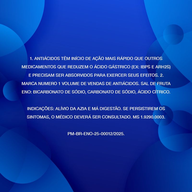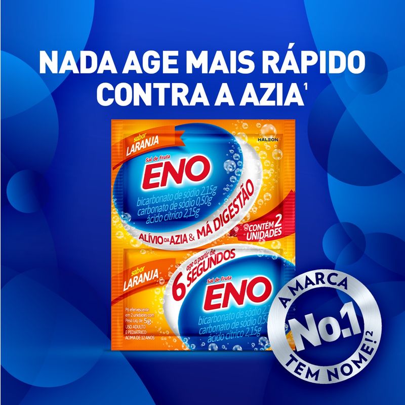 O Sal de Fruta Eno é um medicamento antiácido em pó efervescente, com um agradável sabor de laranja. Ele é especialmente formulado para proporcionar um alívio rápido da azia, má digestão e outros desconfortos estomacais causados pelo excesso de acidez. Sua ação começa logo após a ingestão, neutralizando o ácido clorídrico no estômago e aliviando a sensação de queimação e indigestão ácida. É uma solução prática e eficaz para quem busca alívio imediato de transtornos como a hiperacidez gástrica, agindo diretamente na causa do desconforto.