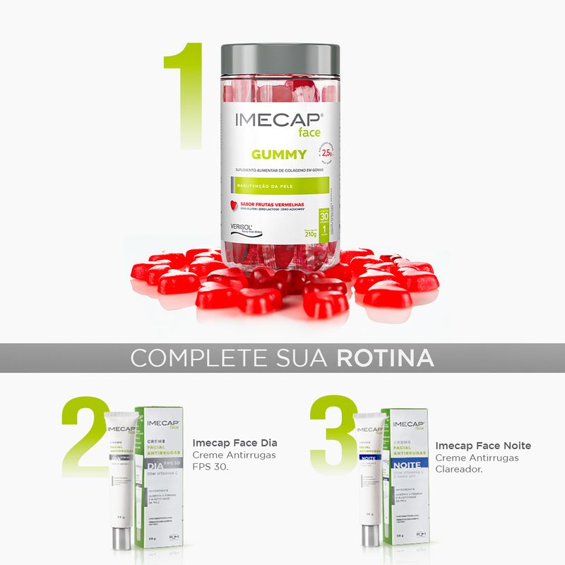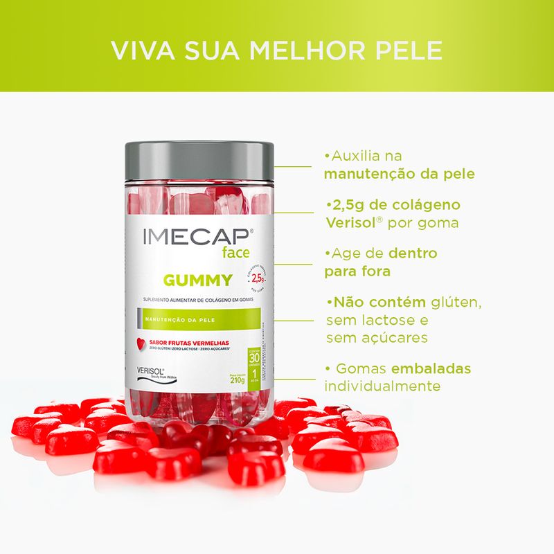 Suplemento Alimentar Imecap Face Gummy 30 Gomas é um suplemento de colágeno em gomas desenvolvido para o cuidado da pele do rosto. Formulado com colágeno hidrolisado Verisol®, uma tecnologia patenteada de origem alemã, o produto atua de dentro para fora auxiliando na manutenção da firmeza, elasticidade e hidratação da pele. As gominhas têm sabor frutas vermelhas, formato de coração e são livres de glúten, lactose e açúcares adicionados.