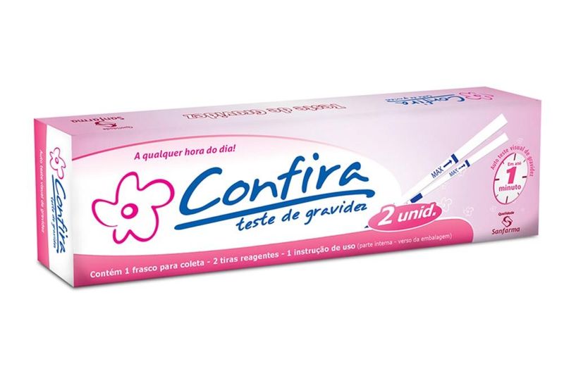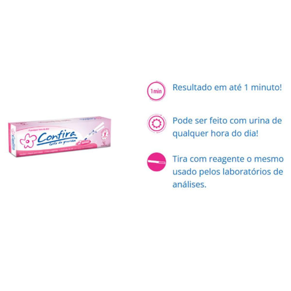 O Confira duplo Teste Tira é rápido e eficaz. Possui precisão superior a 99% e pode ser realizado a qualquer momento do dia, a partir do primeiro dia de atraso da menstruação. A embalagem possui 2 unidades para dupla verificação.