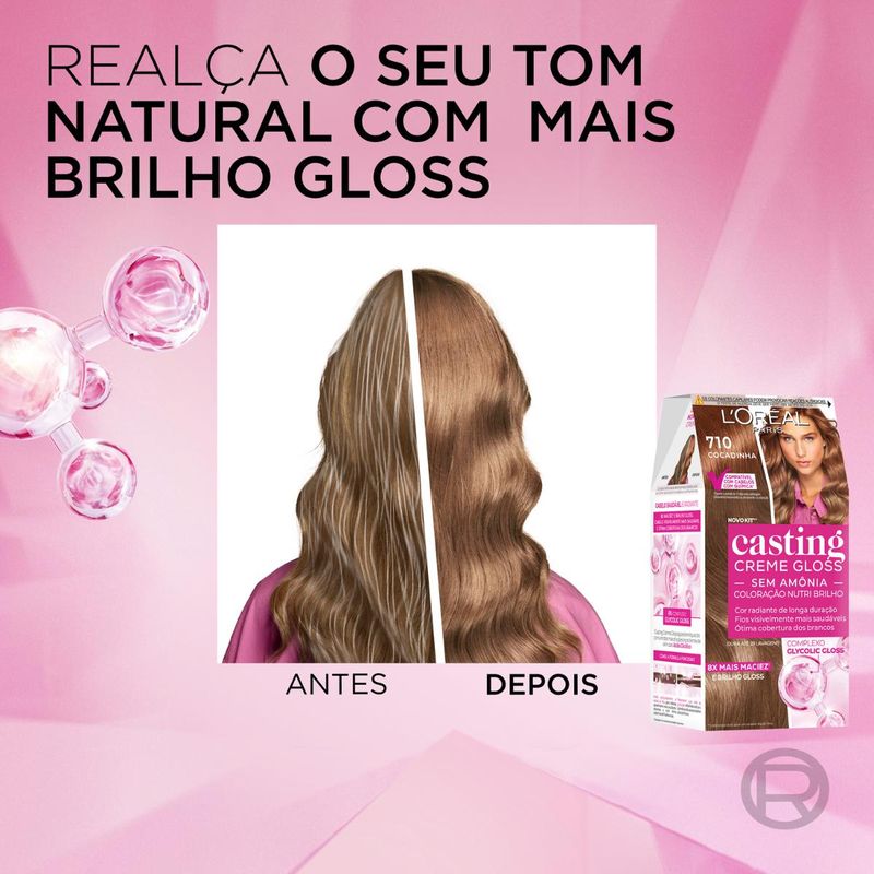 O Casting Creme Gloss 710 Cocadinha serve para oferecer cobertura suave de fios brancos, iluminar os cabelos com reflexos loiros e garantir brilho gloss. Sua fórmula sem amônia é ideal para quem deseja colorir sem agredir os fios, proporcionando um resultado de cor uniforme, com aspecto saudável e natural. Além da coloração, o produto trata a fibra capilar, deixando os cabelos mais fortes e macios.